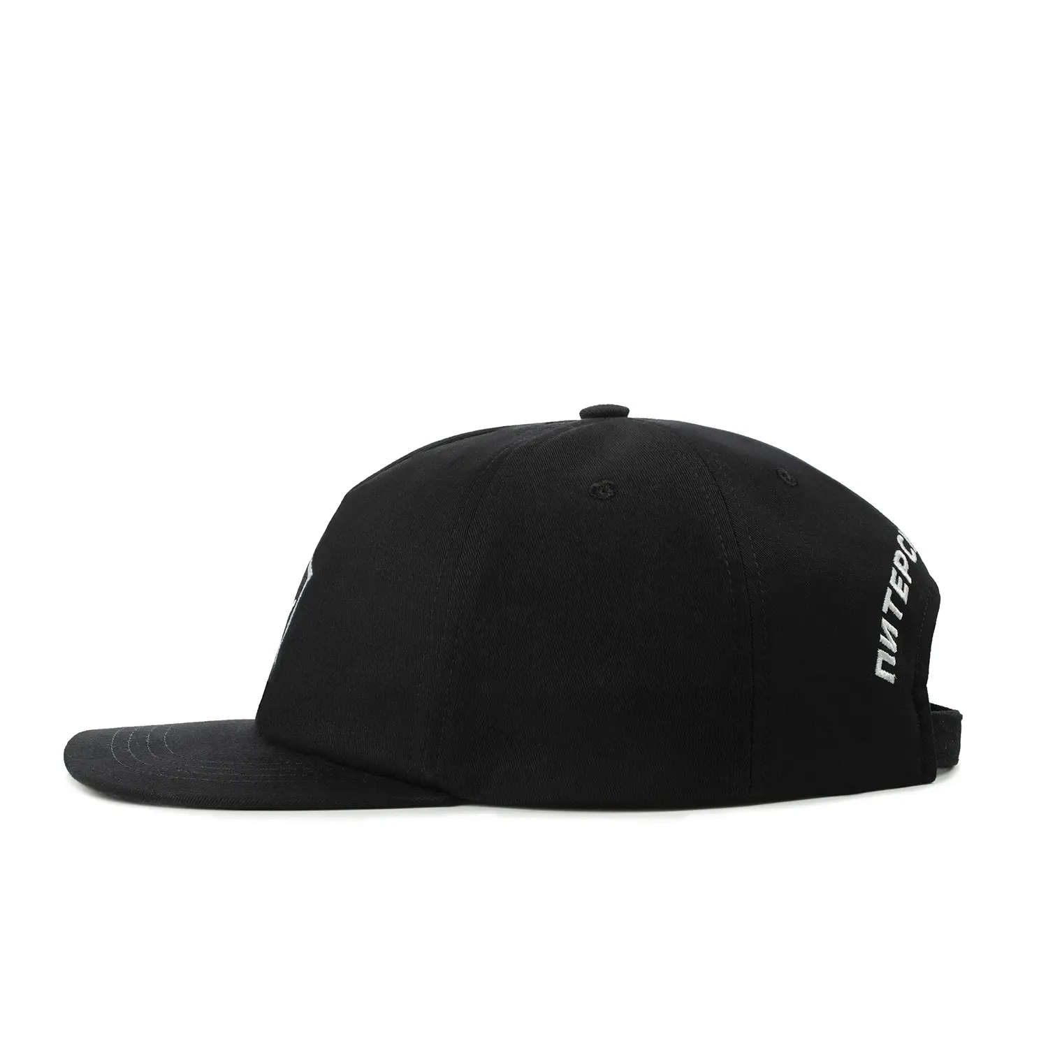 Бейсболка имеет классическую винтажную форму. Спереди расположен объединенный логотип ONYX и Питерский Щит. Сзади кепки расположена крупная вышивка бренда. Посадку аксессуара с вышитой эмблемой удобно регулировать ремешком с брендированным слайдером.