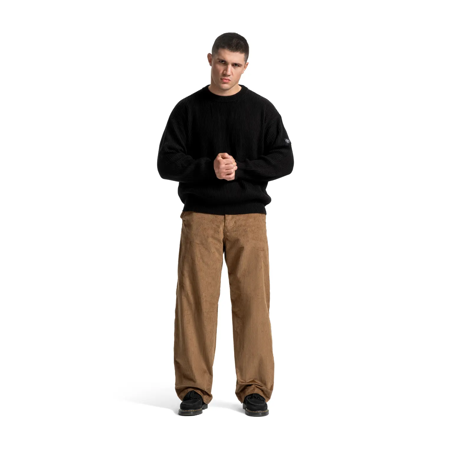 Брюки свободного кроя выполнены из плотного крупного вельвета.