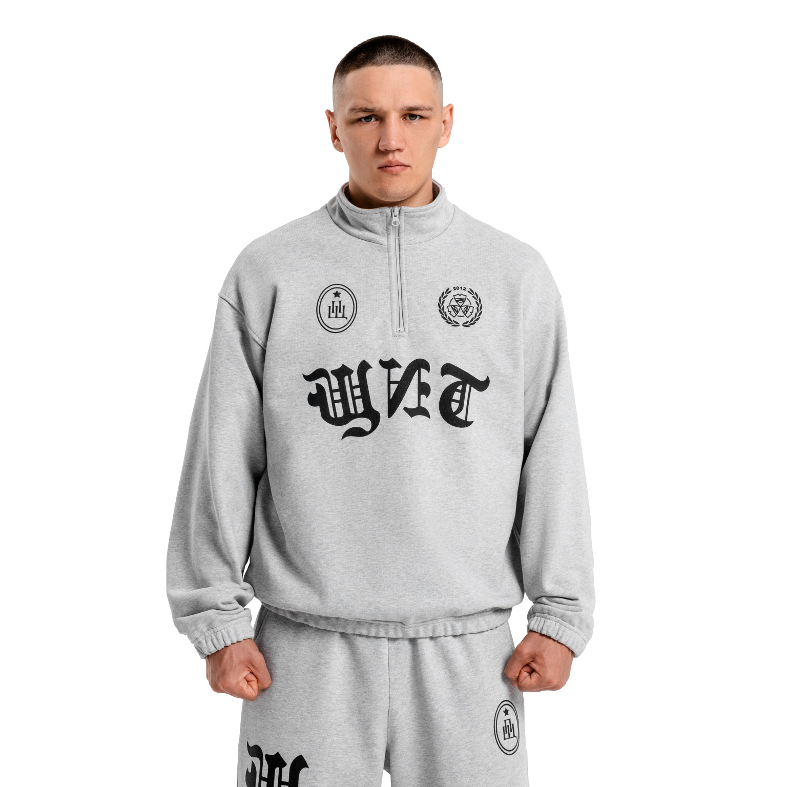 Толстовка на молнии 1/2 свободного кроя выполнена из плотного футера без начеса.