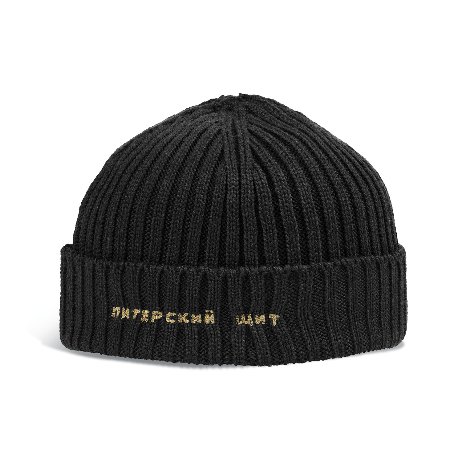 Короткая шапка-бини в чёрном цвете изготовлена из полушерсти.